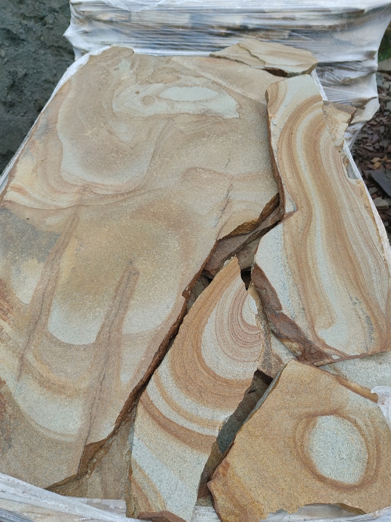 Песчаник жёлтый с разводами - для работ по облицовке стен, фундаментов, заборов.